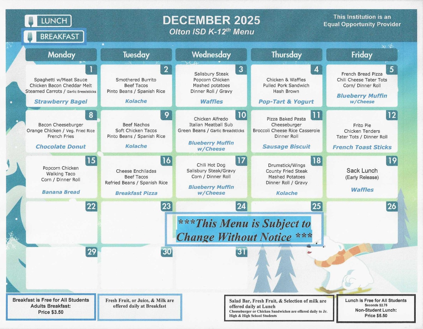 The Olton ISD announced it will operate the Community Eligibility Program (CEP) under the National School Lunch Program and School Breakfast Program for the 2024-2025 school year. Schools qualifying to operate CEP serve breakfast and lunch to all children at no charge and eliminate the collection of meal applications for free, reduced-price, and paid student meals. This approach reduces burdens for both families and school administrators and helps ensure that students receive nutritious meals.